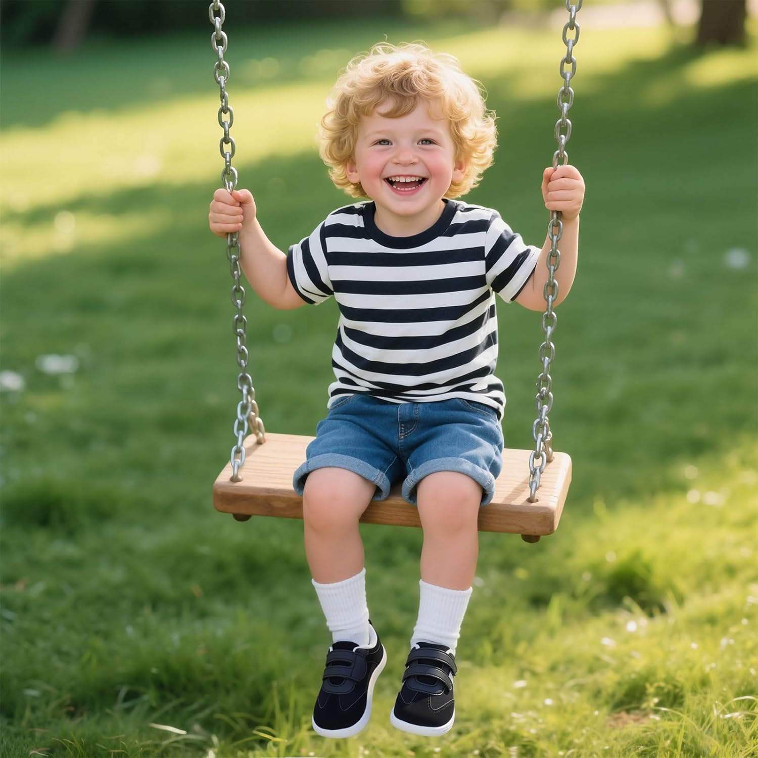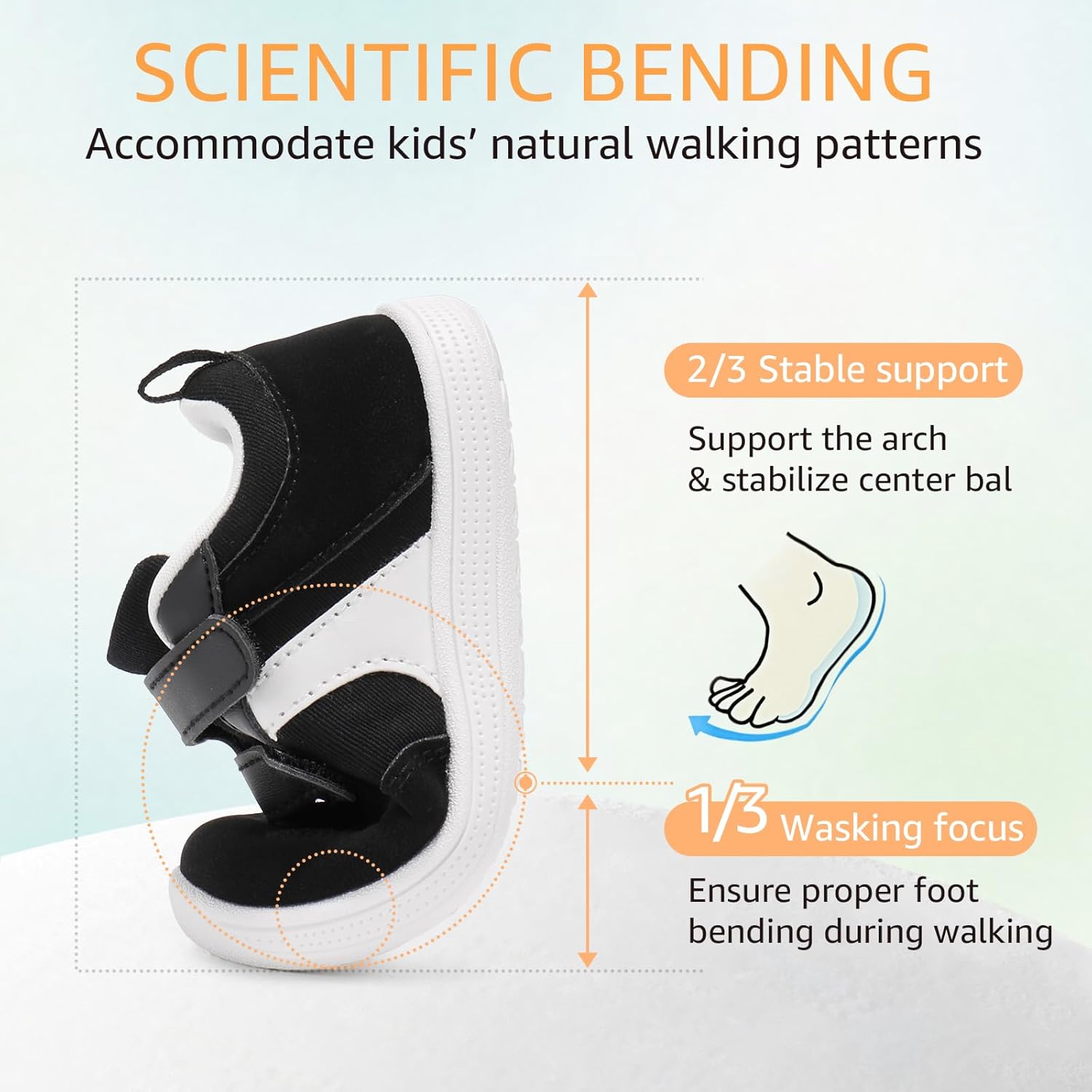 • [ Non-Slip Outsole ]: The treaded sole of these toddler first walking shoes offers excellent grip to help prevent slips and keep kids safe during play. The flexible 1/3 groove supports natural foot movement, perfect for active steps