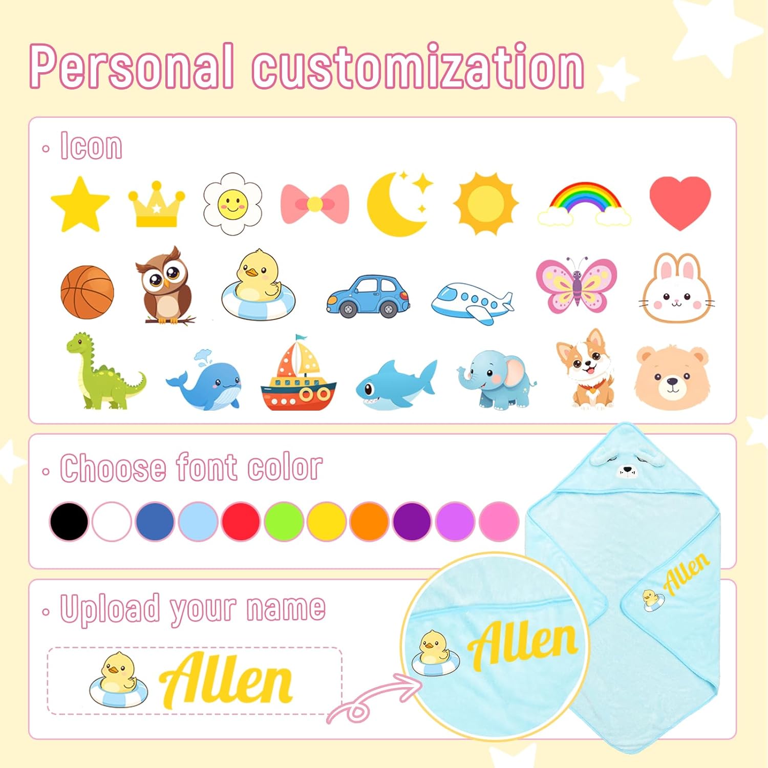 - Customize Now: Personalized baby bath towels can add the baby's name and cute pattern, embroidery or color printing. Chic and colorful animal face hood and custom designs will make the little one unique. It will be a special baby shower gift!
