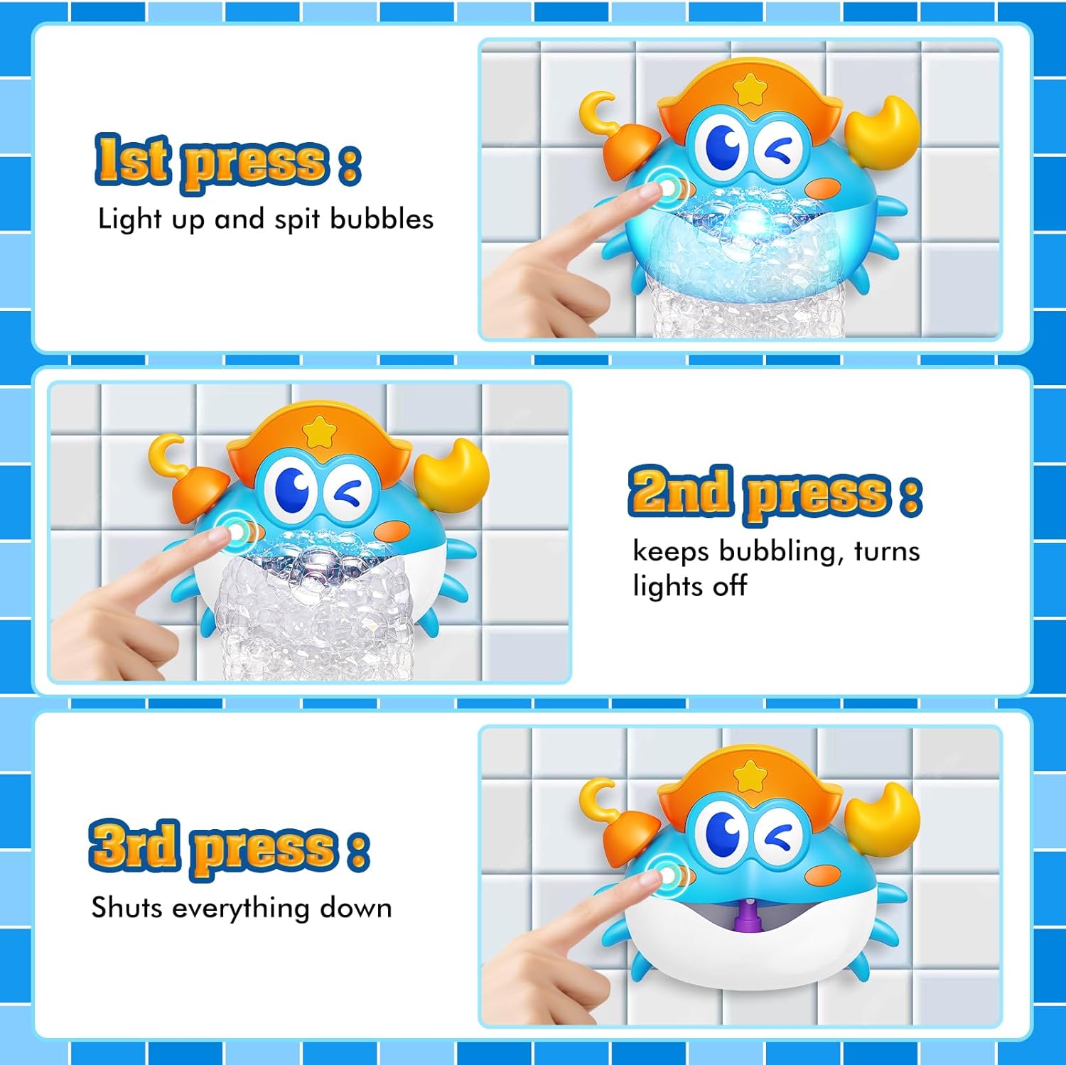 - FUN BUBBLE BATH TOY SET: This adorable crab bubble machine creates a waterfall of bubbles, while colorful LED lights captivate your child’s attention. The wind-up swimming toys add extra bath-time fun, turning washing into a joyful experience.