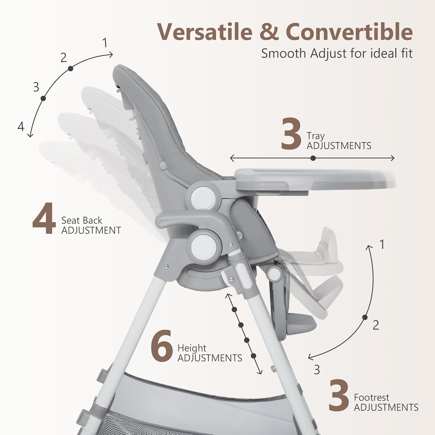 - Multifunctional High Chair: It can be converted to a Infant highchair, baby feeding chair, toddler high chair and child seat or more; Meet your various needs: 6 position height, 4 position seat recline, 3 position footrest, 3 position trays