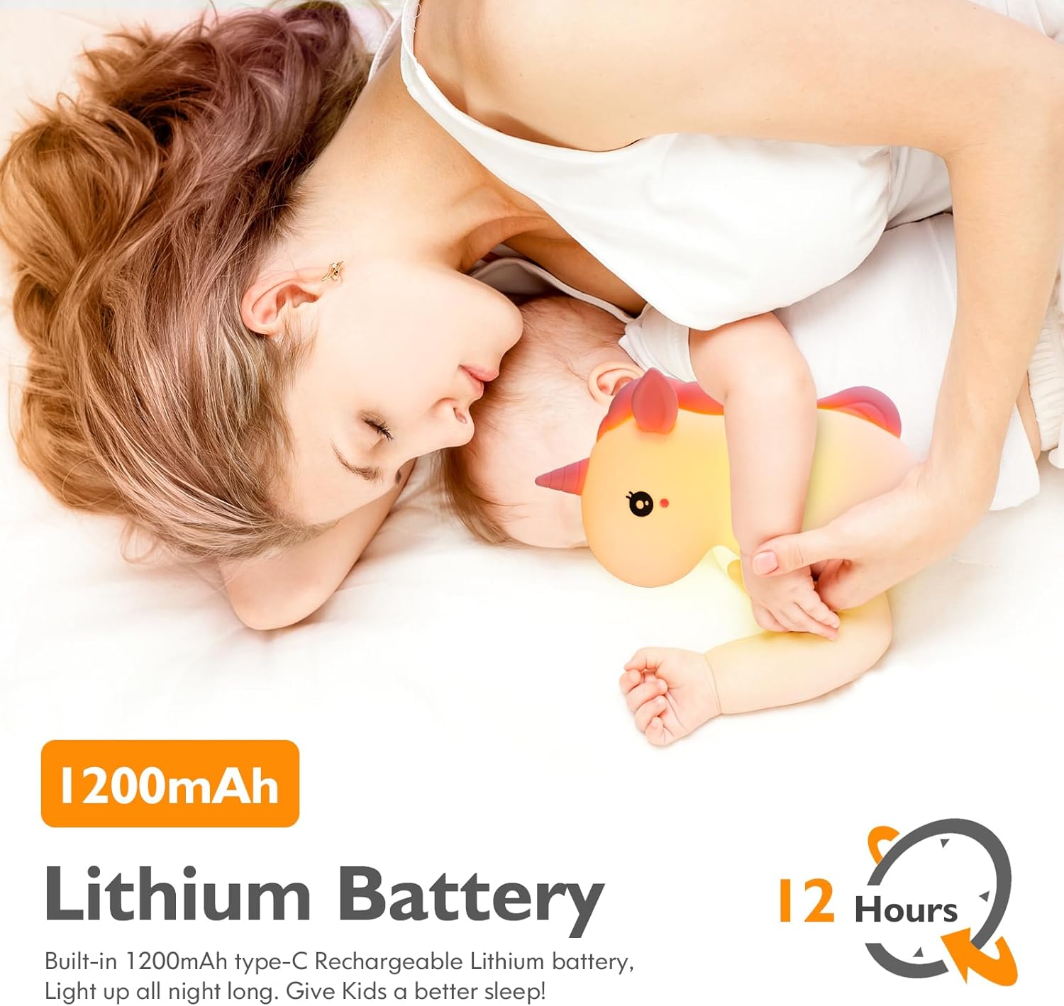 - π¦ NICE COMPANION FOR LITTLE KIDS: The Unicorn night light a great companion for kids.If children have difficulty sleeping due to fear of the dark, the baby night light + Unicorn night lamp will be his "best companion". With a good companion, kids will no longer be afraid and gradually overcome their phobia of the dark and will be able to sleep independently again in the future, which will be a very rewarding thing for kids. Ideal as a bedside kids lamp for bedrooms or a girl's room decor. Popular for Xmas gift, Christmas gift, Thanksgving day, birthday, daily reward and New Year
